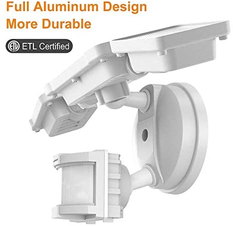 FULL METAL DESIGN & IP65 WATERPROOF: The outdoor security lights motion is made of FULL Aluminum, have excellent heat dissipation, which is more durable than other brands; The lifespan of light will be up to 50,000hrs; Upgraded IP65 waterproof, can be against any type of terrible weather like a rainstorm, sleet or snow, perfect for the porch, back yard, front door, garage, driveway, walkway, step, etc.