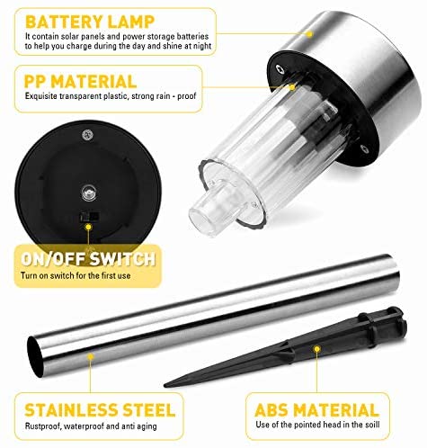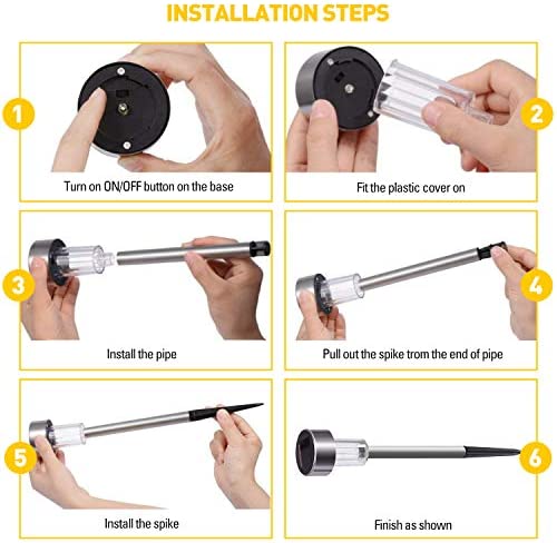 EASY INSTALLATION: Just in few minutes, the solar powered lights can be done on assembling. Please remove the isolator tab under the light cap for first time use, and install each parts together then push the stake into the soil. Please note the stakes are placed in the tubes, need to be pulled out firstly.